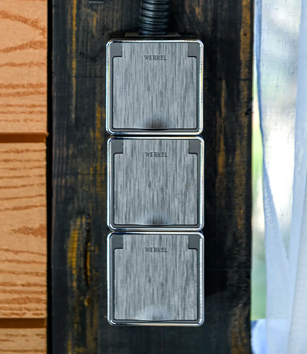 Беседка получила современный облик, где особое внимание уделили функциональности и эстетике. Стены украсили накладные розетки и выключатели Werkel™ из серии Gallant в выразительном цвете рифленый графит. Эти механизмы не только гармонично вписались в интерьер, но и стали его ярким акцентом благодаря фактурной поверхности, имитирующей шлифованный металл, и оригинальной хромированной декоративной вставке.